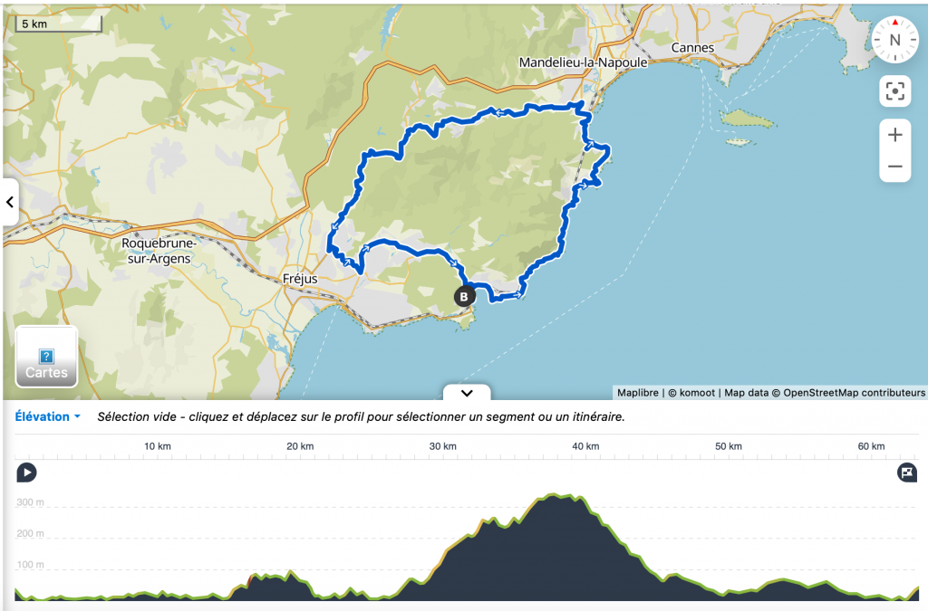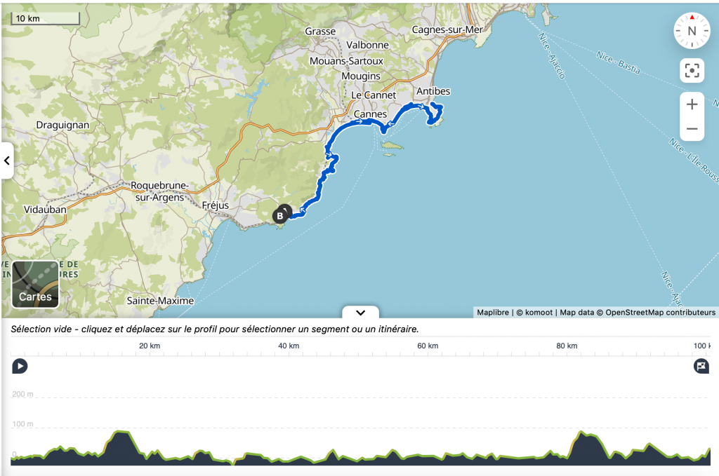 Départ classique par la Corniche d’Or et ensuite de la piste cyclable quasiment jusqu’à Antibes.