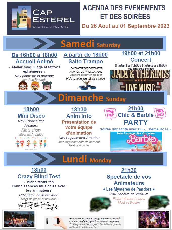 - Dimanche 27 à 18h00 rendez-vous Espace des Arcades pour la mini disco , suivi à 18h30 de « l’Anim Info » ( Prestation des activités de la semaine ) . Enfin rendez à 21h00 Espace des Arcades votre « soirée Chic & Barbie « Soirée dansante avec DJ thème Rose »