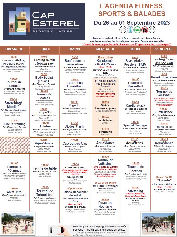 . Pour les lève-tôt votre Footing à 8h00 du matin rendez-vous devant la réception lundi 10 et vendredi 14 juillet pour une durée de 45 mn